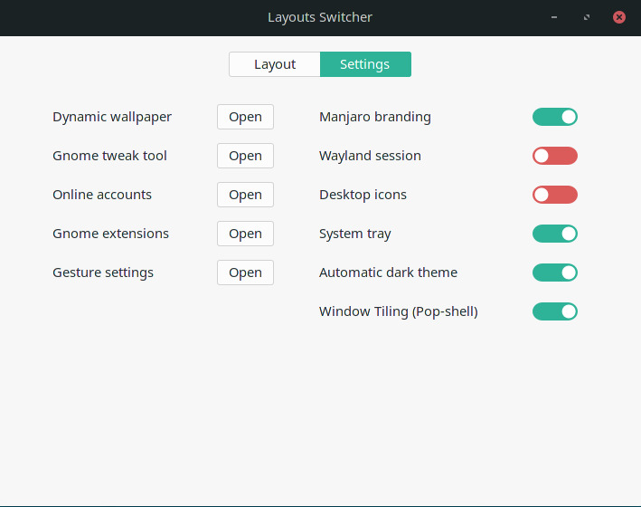 The layout switcher also has a settings tab that gives you quick access to things like gnome tweak tool and gnome extensions, as well as some additional features such as auto dark theme and window tiling.